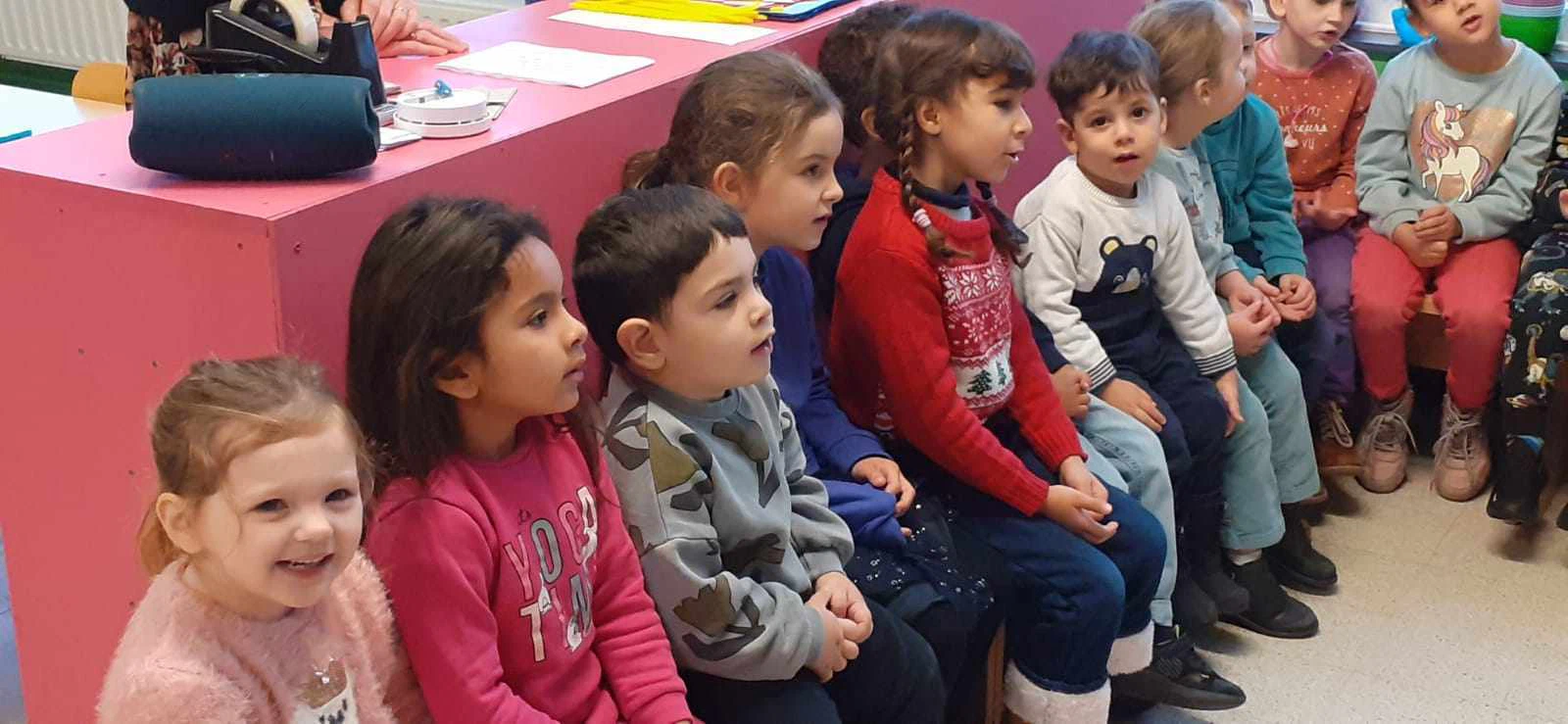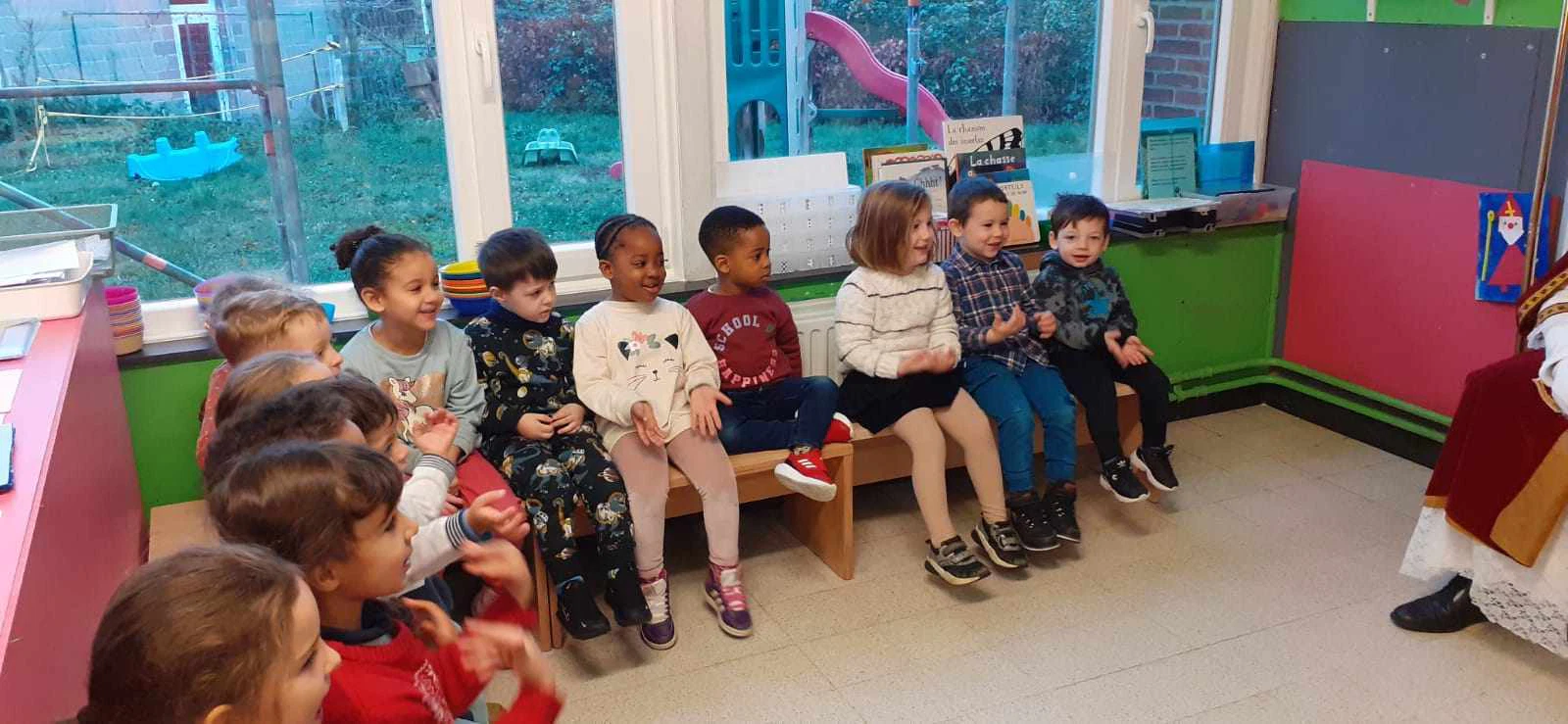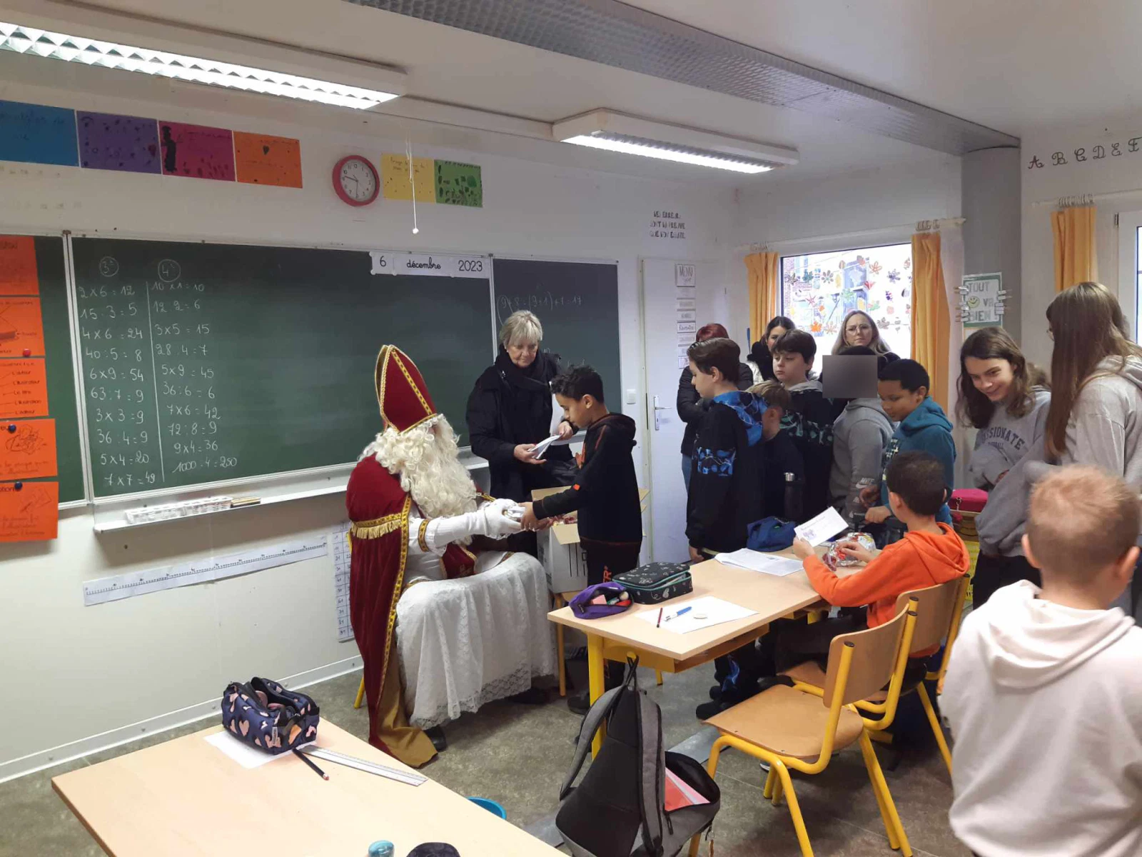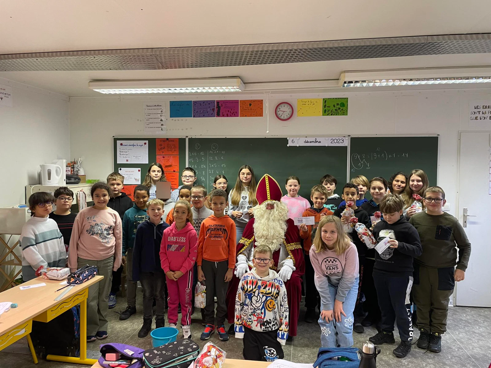 Ce mercredi 6 décembre, Saint-Nicolas nous a rendu visite avec de belles surprises. Les élèves l’ont salué en chantant de jolies mélodies. Le grand Saint a vraiment bien gâté les enfants. Il leur a offert un sachet de friandises, des places de cinéma pour les plus petits et des places pour aller à la patinoire pour les plus grands.